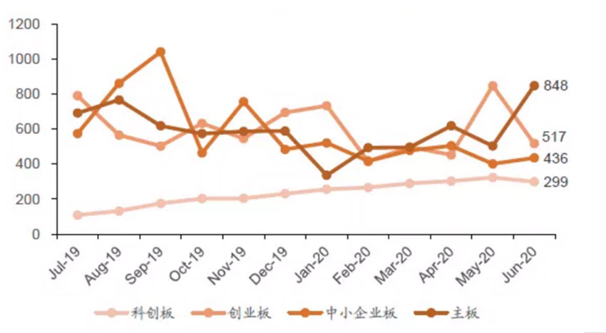 圖:A股各板塊每月上市公司受理到上市所需平均天數(shù)(單位:日)